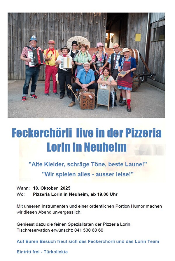 Mit ihren Instrumenten und einer ordentlichen Portion Humor macht das Feckerchörli diesen Abend unvergesslich. Geniessen Sie dazu die feinen Spezialitäten der Pizzeria Lorin